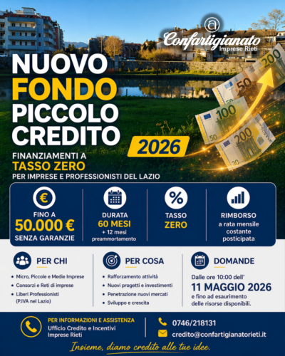 Per maggiori informazioni, consulenza e per presentare la domanda di contributo contattare l’Ufficio Credito e Incentivi di Confartigianato Imprese Rieti, Veronica Ponte – Tiziana Colletti tel. 0746/218131 credito@confartigianatorieti.it